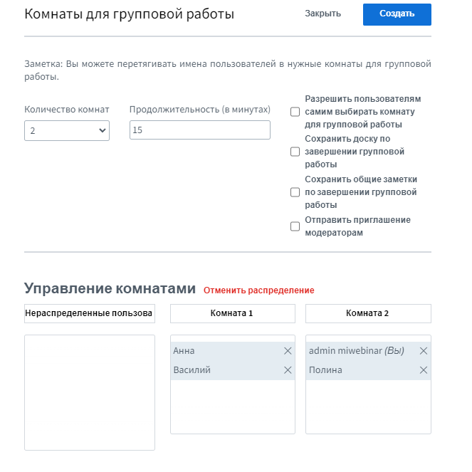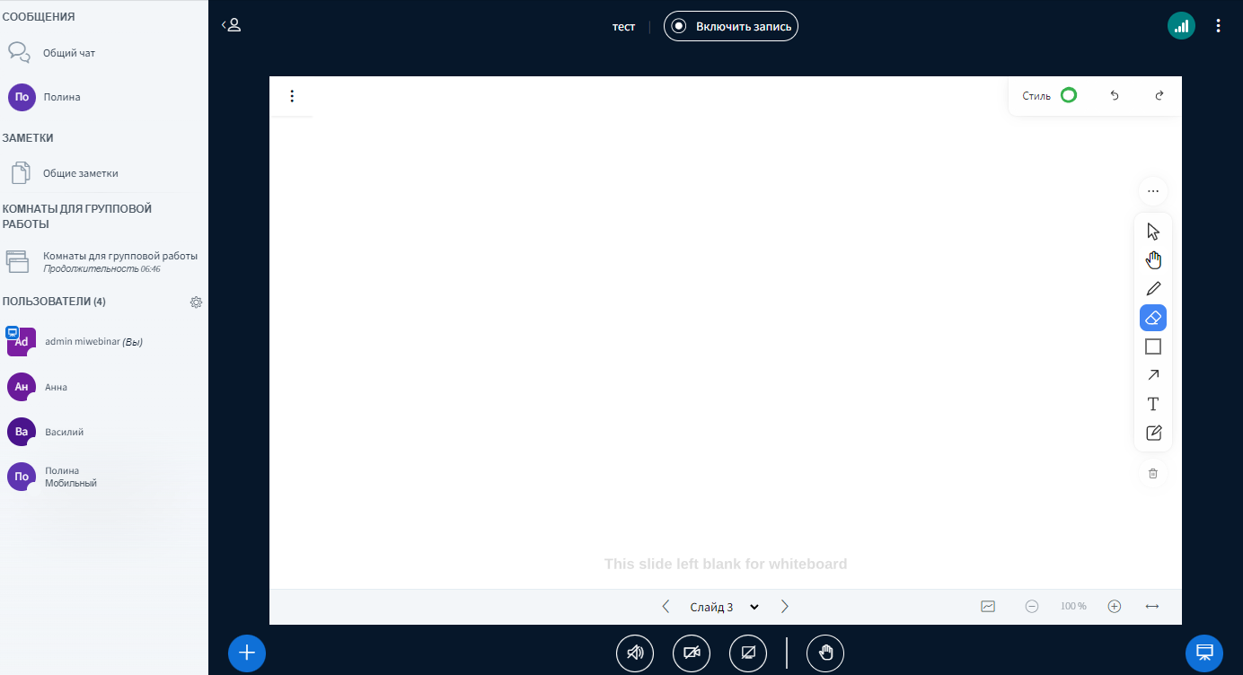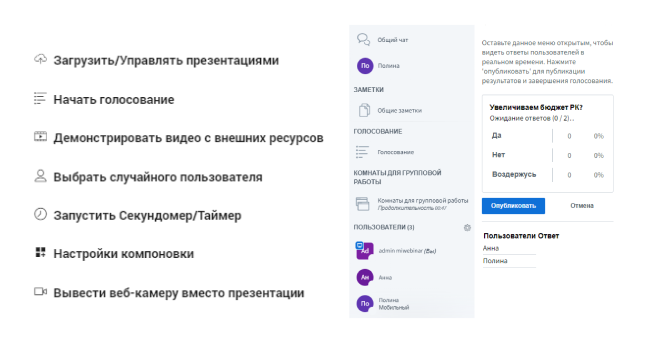 Доступны функции, как доска для записей, демонстрация экрана, трансляция видео, разделение участников на группы, опросы, использование эмодзи