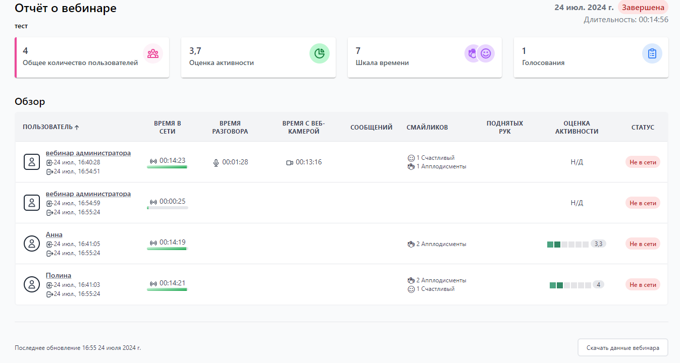 По завершении вебинара вы получите подробный отчёт, в котором будет указано время посещения каждого участника